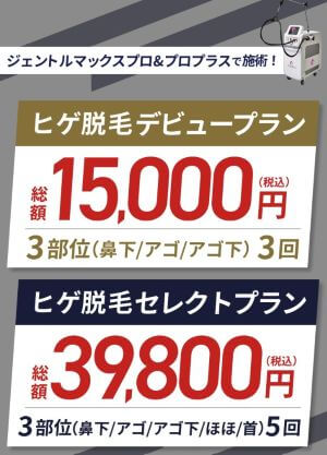 脱毛料金 | ヒゲ3部位 3回 15,000円(税込) ※鼻下・アゴ・アゴ下 | ★4.8 |
