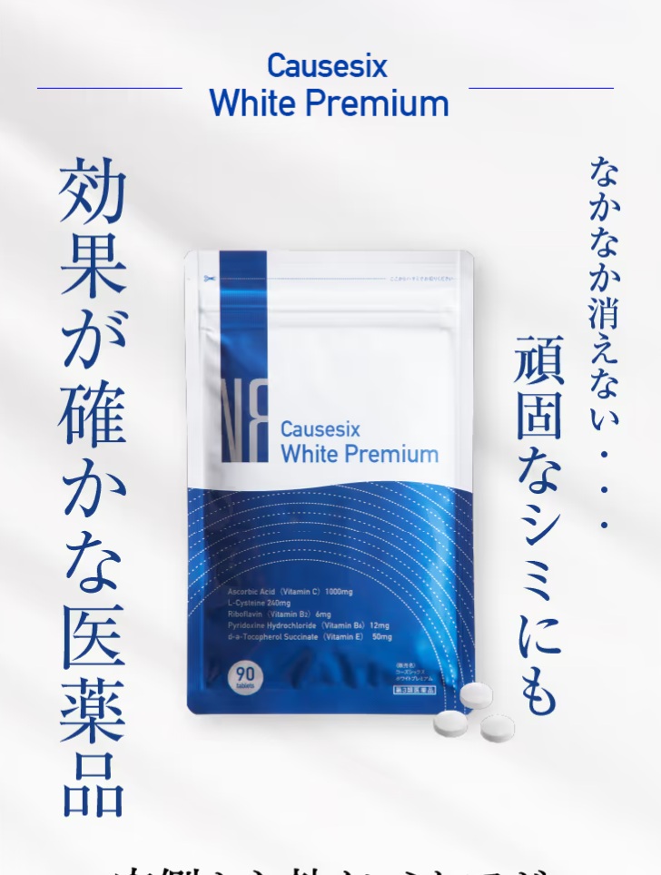 コーズシックスホワイトプレミアムは、体の内側からシミ・そばかすにアプローチする第3類医薬品です。12回、朝と夜に服用するだけで、全身の美白ケアをサポートしてくれます。
