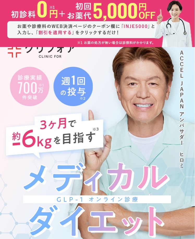 クリニックフォアは、オンライン診療のパイオニア的存在として知られ、累計700万件以上※1の診療実績を持つ大手クリニックです。肥満症治療(メディカルダイエット)にも力を入れており、マンジャロのオンライン診療にも対応しています。