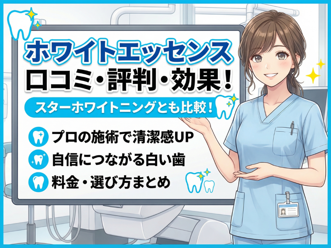 そこで本記事では、大手ホワイトニングブランド「ホワイトエッセンス」の口コミ・評判、料金、効果を調査してまとめました。あわせて、低価格で人気の「スターホワイトニング」とも比較し、自分に合う選び方を整理します。ホワイトニング選びで後悔しないために、ぜひ参考にしてください。