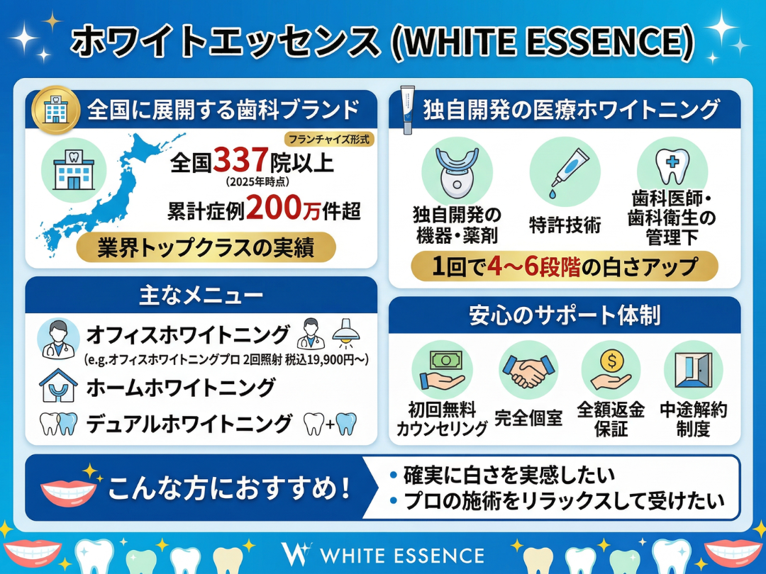 ホワイトエッセンスは、日本全国に展開するホワイトニング専門の歯科ブランドです。全国337院以上(2025年時点)の加盟クリニックを持ち、累計症例数は200万件超と、業界トップクラスの実績を誇ります。各地の歯科医院がフランチャイズ形式で運営しており、独自開発の機器と薬剤を使用した医療ホワイトニングを提供しています。