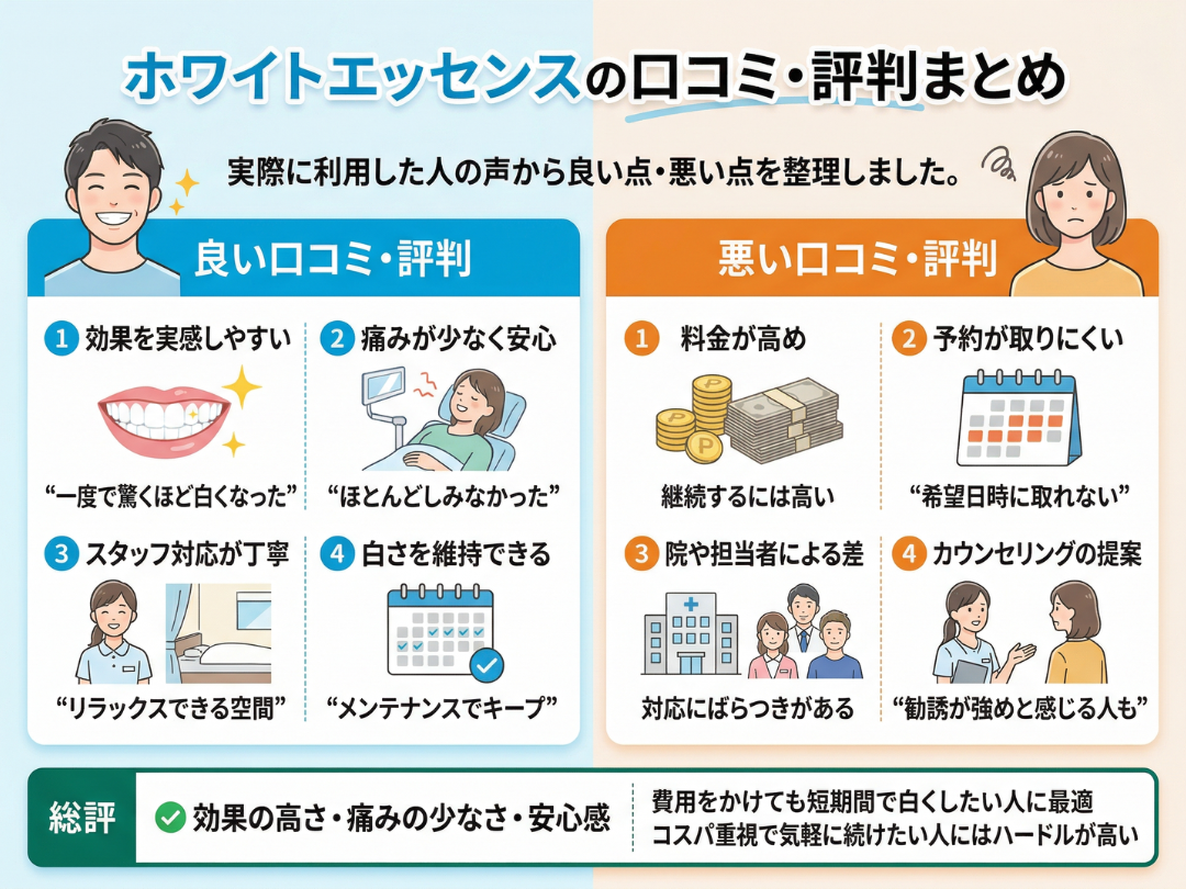 実際にホワイトエッセンスを利用した人の口コミをもとに、良い点・悪い点を整理しました。ホワイトニング経験者の声は、クリニック選びの重要な判断材料になります。