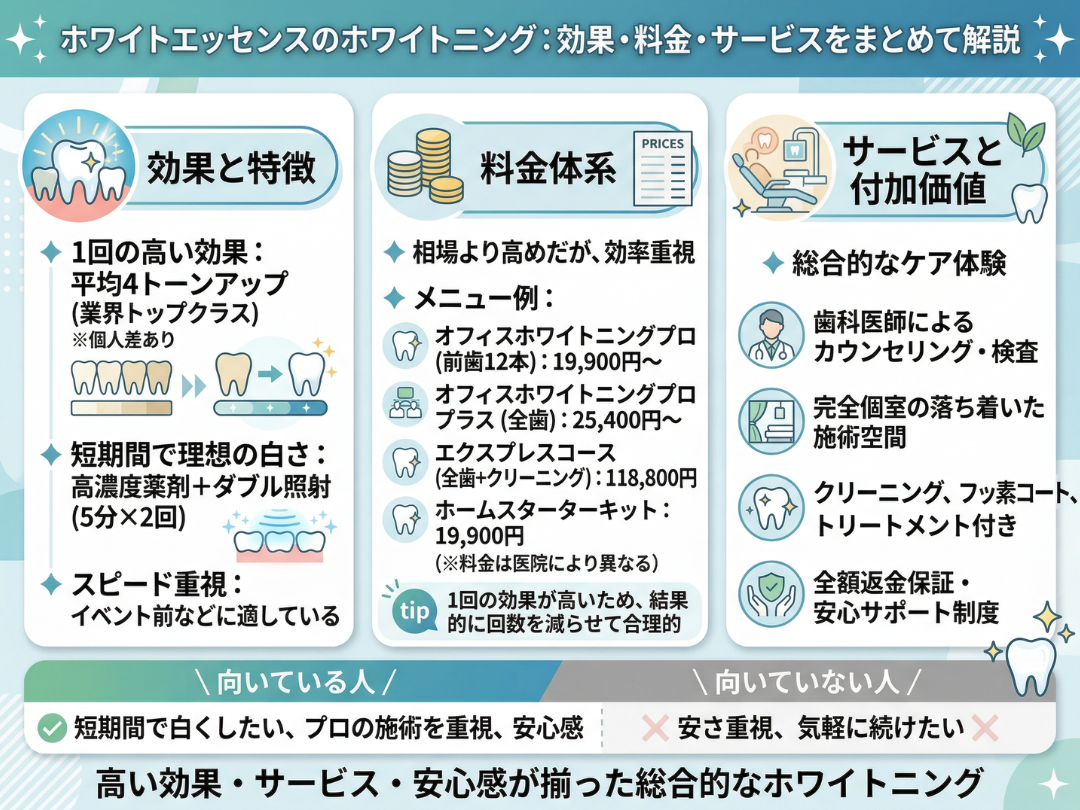 総合すると、ホワイトエッセンスは実績・効果・安心感のバランスに優れたホワイトニングサービスです。「多少費用がかかっても、確実に白さを実感したい」「プロの施術をリラックスして受けたい」という方に向いています。