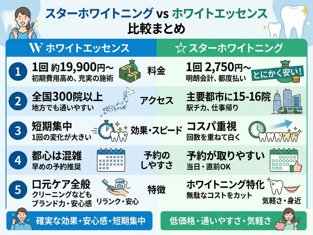 ここでは、ホワイトエッセンスと、近年人気が急上昇しているスターホワイトニングを、料金・アクセス・効果の観点から比較します。