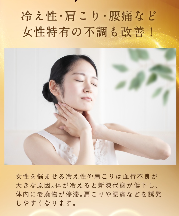 といった作用が期待されています。体の巡りを整えることで肌細胞への栄養供給がスムーズになり、ハリ・ツヤのある肌づくりをサポート。さらに、冷え性や肩こり、めまいといった症状の緩和にも役立ち、内側から健康的な美しさへ導きます。