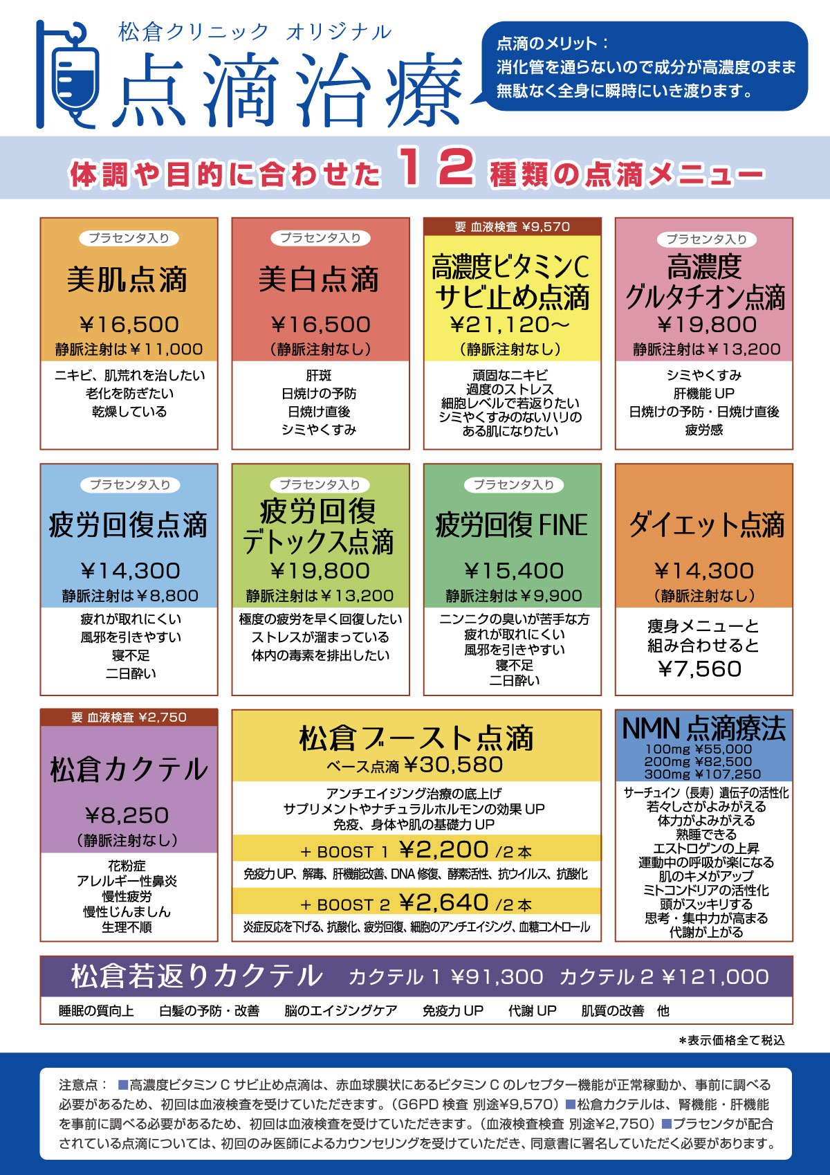- 松倉カクテル(点滴)を受ける方は、初回のみ事前に検査(¥2,700税込)が必要です。結果が出るまでに2週間くらいかかる場合がございます。